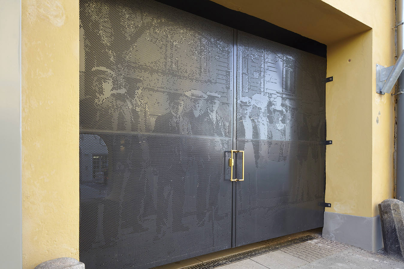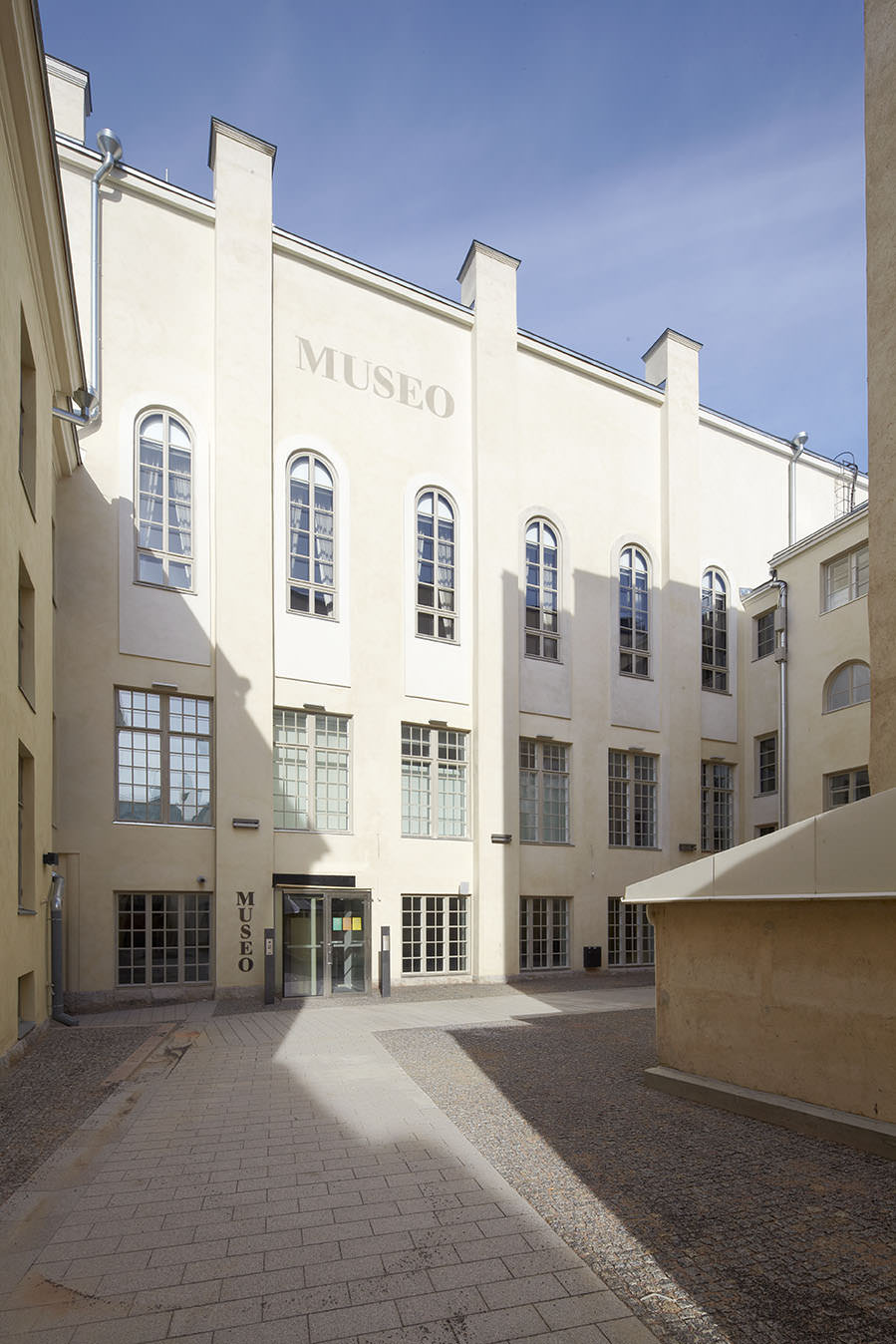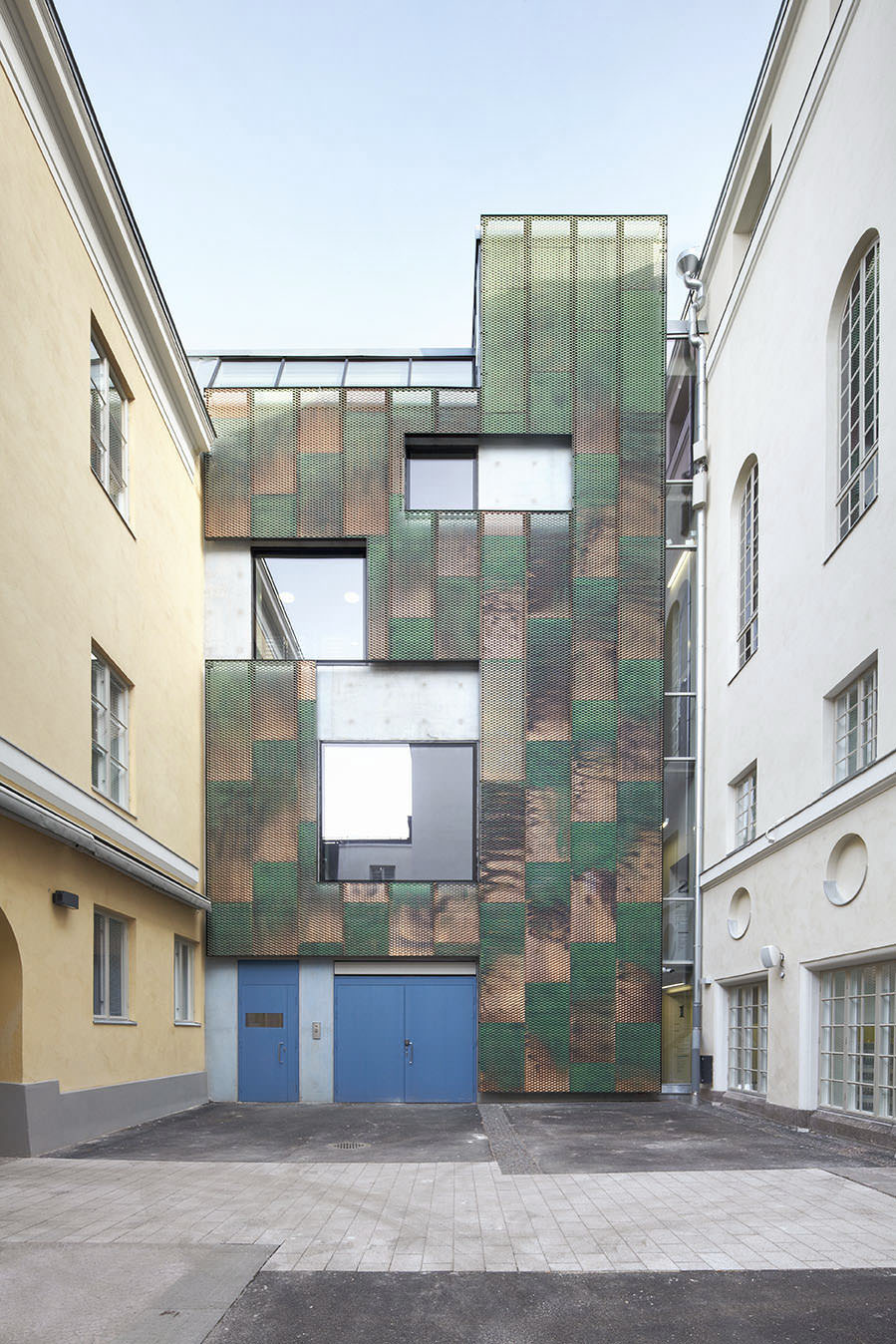 The main entrance from the Aleksanterinkatu through a carriage gateway passes by the only new piece of architecture in the museum. The facade clad with oxidized copper mesh forms a slow-moving material hourglass as a metaphor for the museum. When daylight is low, the metal surface serves as a background for an artwork by light artist Jaakko Niemelä.