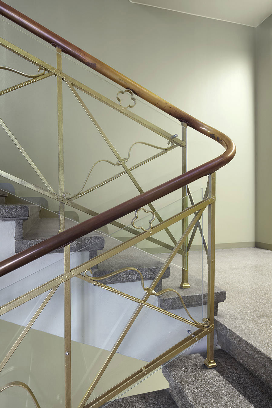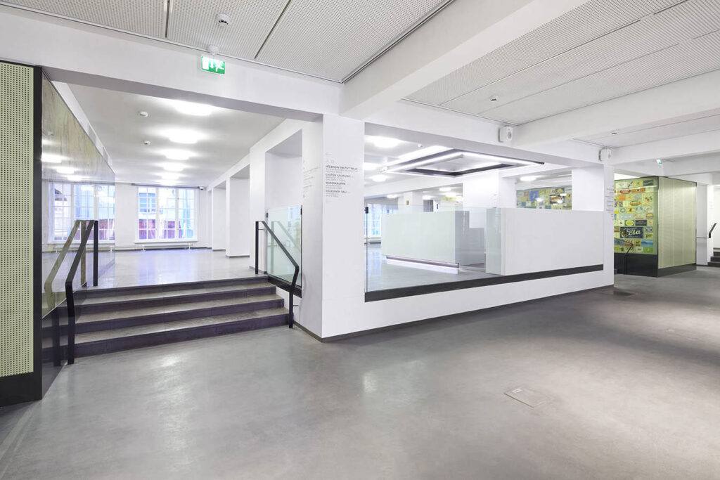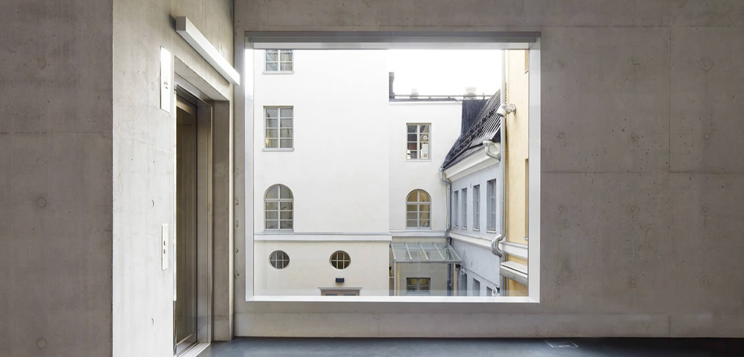 The main entrance from the Aleksanterinkatu through a carriage gateway passes by the only new piece of architecture in the museum. The facade clad with oxidized copper mesh forms a slow-moving material hourglass as a metaphor for the museum. When daylight is low, the metal surface serves as a background for an artwork by light artist Jaakko Niemelä.