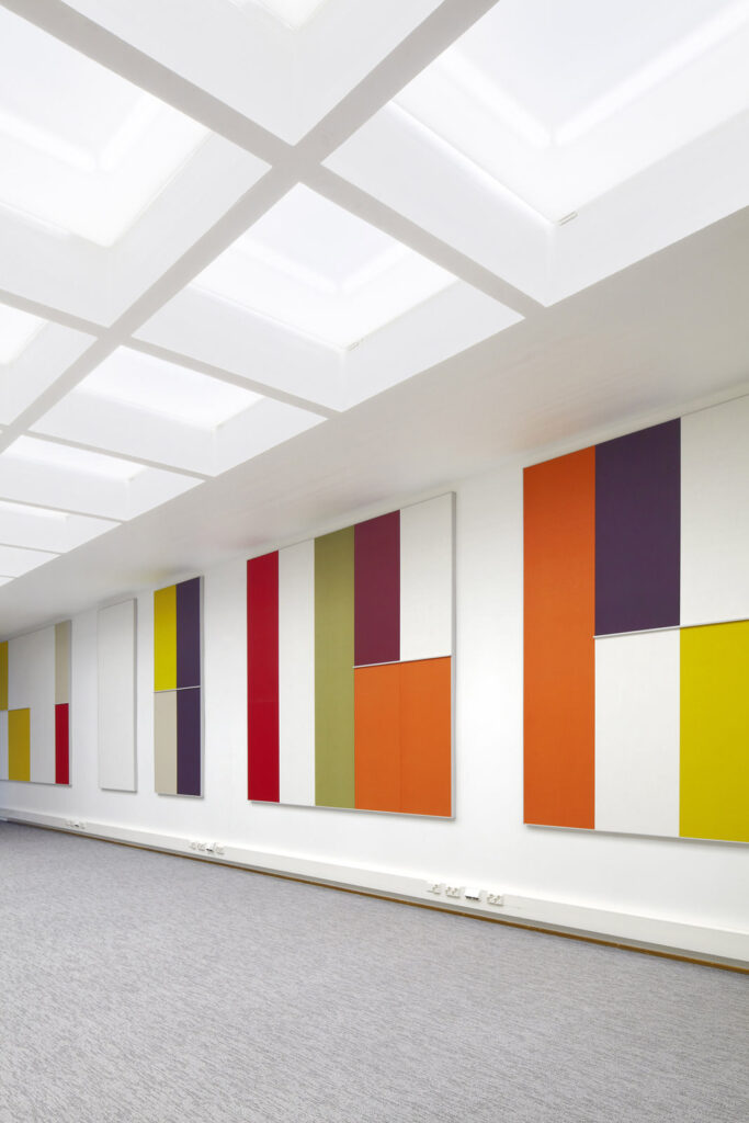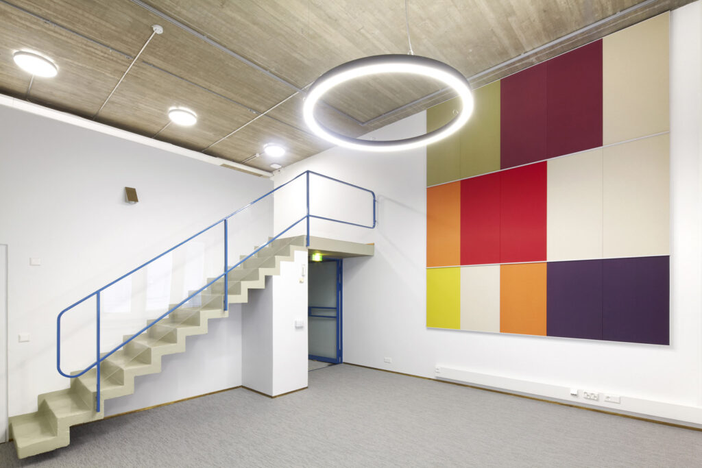 The former Kluuvi Gallery, designed by Professor Aarno Ruusuvuori, is located in the Uschakoff merchant house. Originally completed in 1816, the building, designed by Pehr Granstedt, is protected in the town plan. It was converted for Helsinki City’s administrative use in the 1960s. When the gallery operations ended, the space was converted into offices for the city. Renovation work especially focused on acoustic improvements, which utilized colorful, flat wall cladding elements.