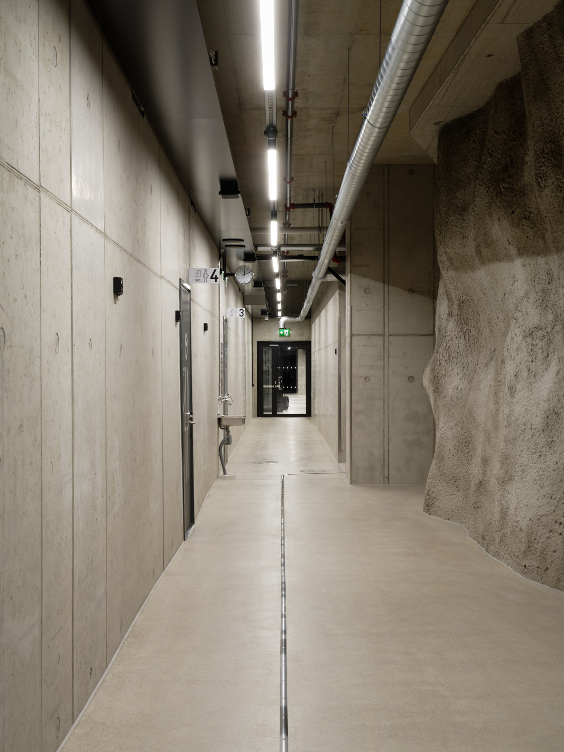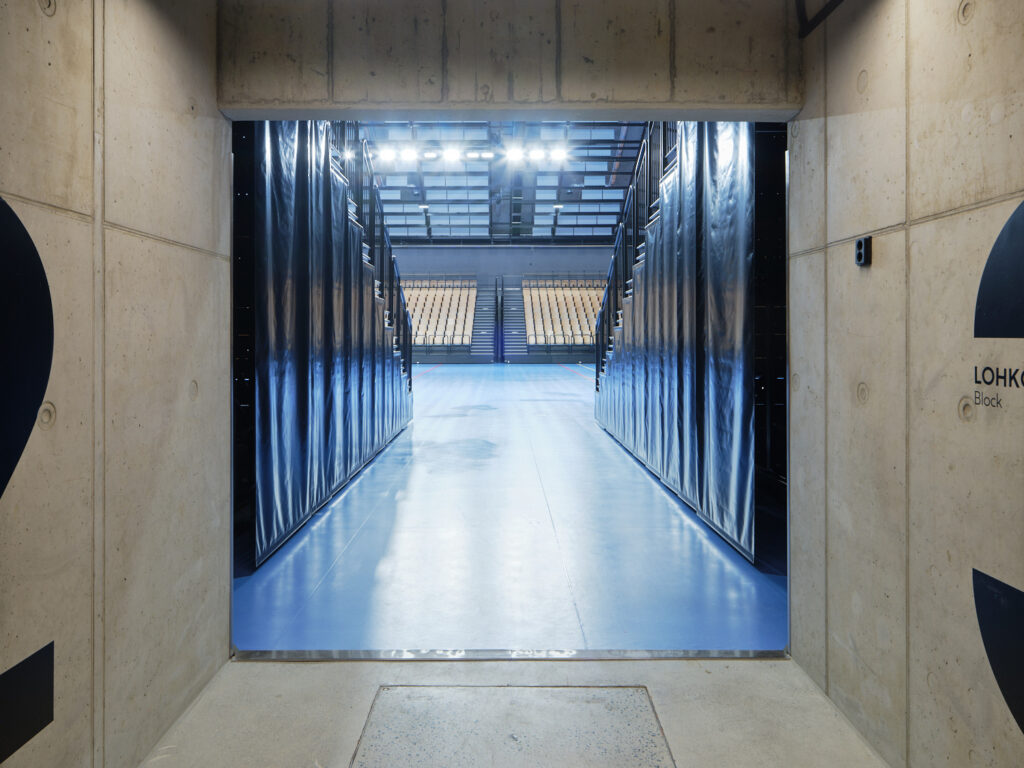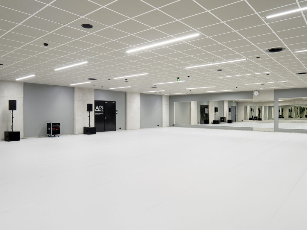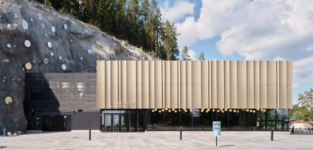 The Luola sports and event centre is located in Neulamäki, on the western edge of the developing district of Savilahti, in a former depot of the Finnish Defense Forces. The most visible part of the centre is the 550 m2 entrance building with its facades of curved and perforated elements of different sizes, where the reception, cafeteria facilities and offices are located. The entire centre will include versatile sports services and assembly spaces for 2 500 people, and the underground facilities also function as the area’s civilian shelter space for 6 790 persons. The main part of the sports and event centre is carved into the bedrock of Neulamäki. By expanding the tunnels of the army depot, a large, unified space was formed underground.
